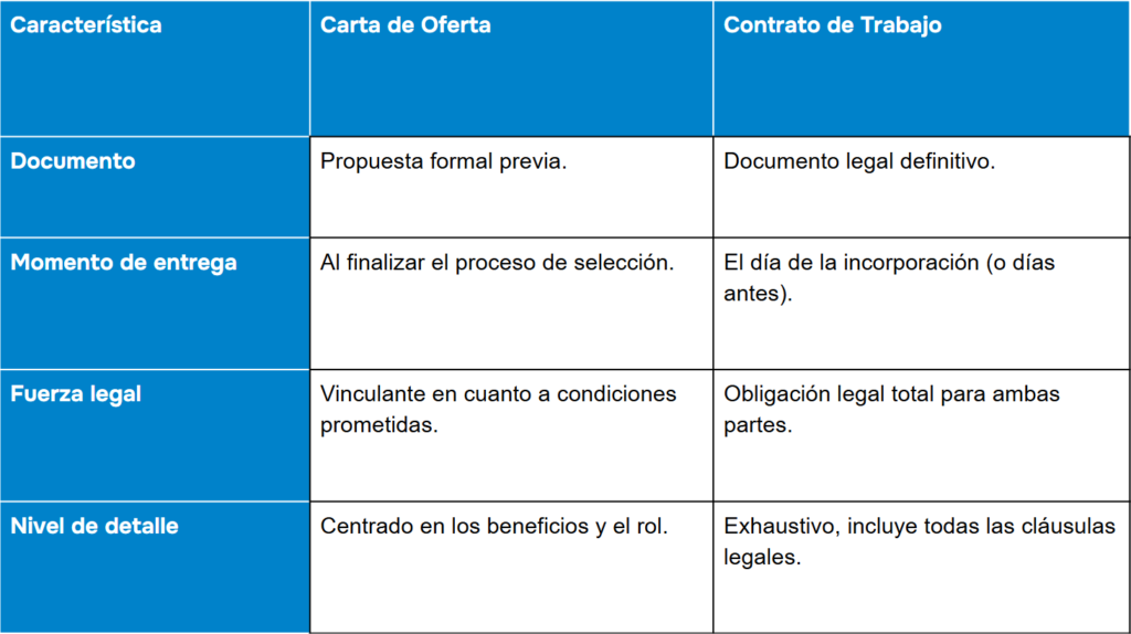 La carta de oferta suele ser mucho más ágil y “amigable”. Es una herramienta de seducción profesional, mientras que el contrato es puramente normativo.